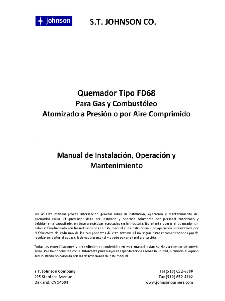 type fd68 gas, pressure and air atomizing oil burners installation, operation, and maintenance instruction manual notice:. Modulating control system based 2. Integral forced draft blower, odp motor 3. Atomizado a presión o por aire comprimido. Johnson offers a complete product line. all fd68 burners include: este manual proporciona instrucciones para la instalación, operación y mantenimiento de un quemador tipo fd68 que quema gas o.